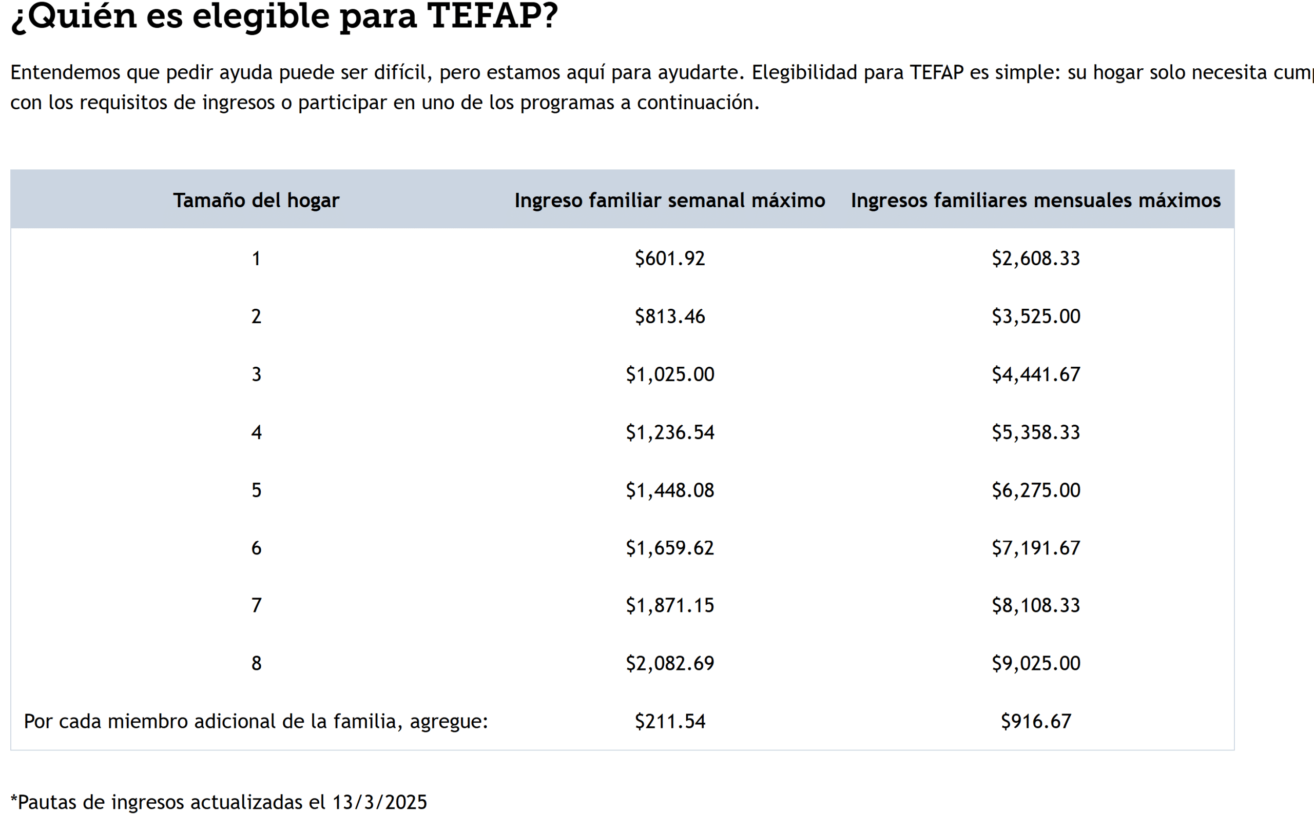 • Para las pautas de elegibilidad por ingresos del TEFAP para 2025, haga clic aquí.